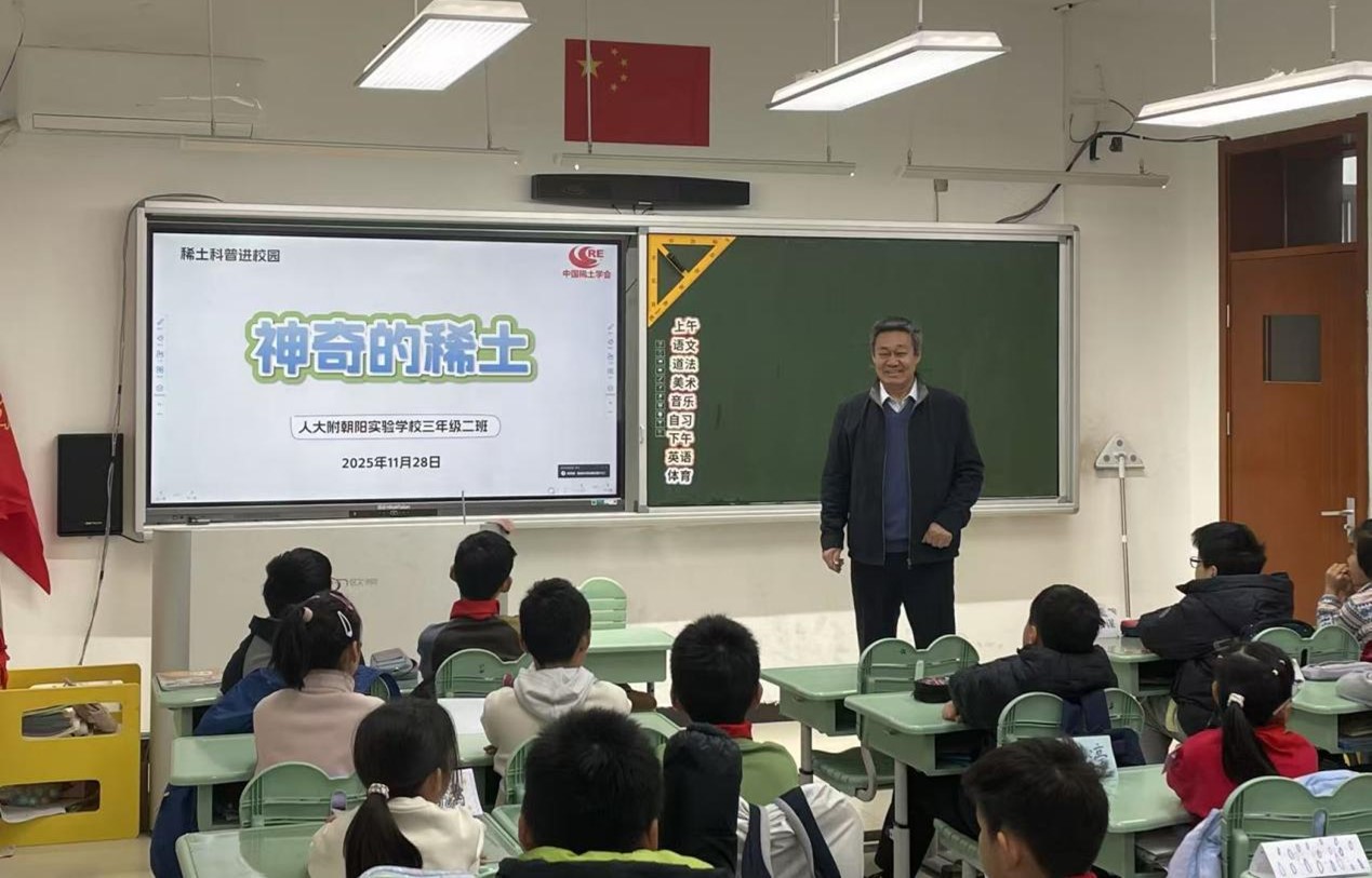 为大力弘扬科学精神,普及稀土科学知识,2025年11月28日上午,中国稀土学会副理事长兼秘书长杨占峰教授应邀前往人大附中朝阳实验学校,为同学们带来了一场别开生面的科普讲座——《神奇的稀土》。