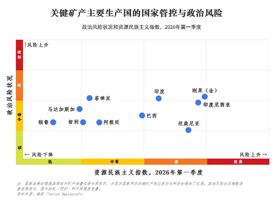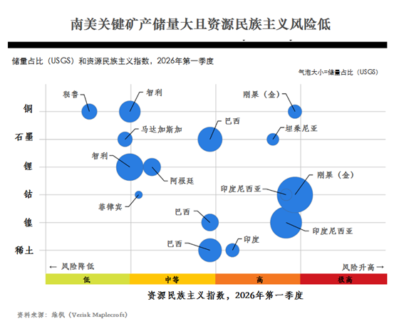 安第斯地区风险低 大多数南美生产国不在世界资源民族主义高风险之列。秘鲁、智利和阿根廷是全球表现最好的国家。 “南美国家分化之处不在于储量大小,而是风险分布”,维枫公司首席分析师吉梅纳·布兰克(Jimena Blanco)认为。“生产国一直是高技术关键矿产资源丰富外加资源民族主义和政治风险相对不高”。 该公司认为,南美地区整体风险不大,但也警告说,某些国家的风险不小。 这已经反映在最新西方行动之中,比如欧盟与印度签署自由贸易协议,部分是因为稀土,美国同刚果(金)在2025年12月签署战略矿产合作框架协议。